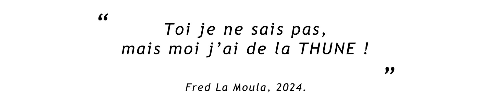 Le saviez-vous : « Fred LaMoula est propriétaire d’un des acteurs industriels majeurs dans le monde de l’automobile, le constructeur MSA (Moula Société Anonyme). Le constructeur emploie 85 000 personnes et réalise un bénéfice de 20 milliards d’Euros en 2023 en ne vendant qu’une seule voiture ! En effet l’usine ne produit qu’un modèle par an vendu en exclusivité à Fred La Moula. »